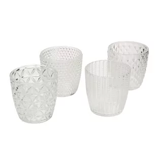 Oryginalny komplet szklanych świeczników we wzory. Zestaw czterech świeczników wykonanych z transparentnego szkła to wspaniała alternatywa dla tradycyjnych lampionów. Każdy świecznik posiada inny, różniący się od pozostałych, wypukły wzór. Świecznik tealight sprawdzi się w salonie i sypialni tworząc nastrojową atmosferę pełną przytulności i ciepła. Wymiary: 1szt. : śr. 9cm, wys. 9cm; waga 0,28kg.