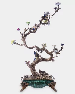 Niesamowity, duży świecznik na trzy świece w formie ukwieconego drzewka Bonsai z ptakami, wykonany z porcelany i brązu. Subtelna dekoracja wykonana bardzo precyzyjnie, z dbałością o najdrobniejsze detale. Bogato zdobiony i ręcznie malowany. Posiada wiele pięknych detali. Robi ogromne wrażenie estetyczne i ma ponadczasowy styl.