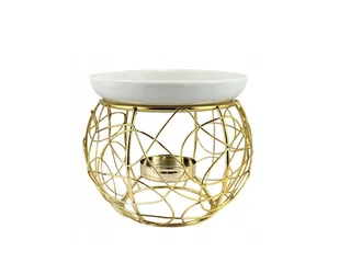 Uroczy świecznik na wosk lub olejek zapachowy wykonany został z metalu oraz ceramiki. Dolna, metalowa część kominka jest koloru złotego, ozdobiona ażurowym w...
