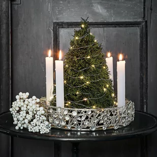 Ponieważ uchwyty na świeczki są umieszczone na krawędzi, w środku pozostaje dużo miejsca na inne dekoracje. Już samo połyskujące żelazo przyciąga wzrok, ale możesz tu wykazać się kreatywnością i dodać liście, gałęzie, figurki i inne drobiazgi. To doskonałe miejsce na Twoje sezonowe dekoracje. Świecznik ten będzie cieszył przez cały rok, a w okresie Bożego Narodzenia możesz go również wykorzystać jako alternatywny wieniec adwentowy w wariancie ekologicznym. Ciesz się eleganckim designem w czystej postaci lub twórz dodatkowe kreatywne dekoracje – tutaj wyobraźnia nie ma granic.
