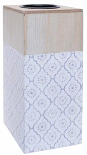 prostopadłościenny drewniany śwecznik, zdobiony biało-szarym wzorem