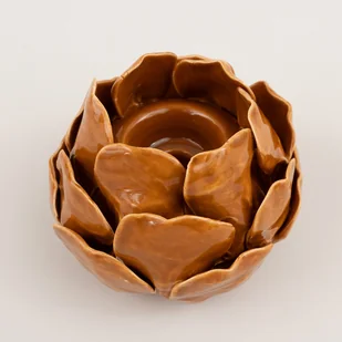 Świecznik Petalia w kolorze karmelowym, wykonany z kamionki. Petalia w karmelowym kolorze to świecznik na tealighty, który zachwyca naturalnym, ciepłym odcieniem i wyjątkową formą inspirowaną kwiatem. Ułożone jak płatki elementy przyciągają wzrok i nadają wnętrzu przyjaznego, harmonijnego charakteru. Idealny jako centralna dekoracja na stół, świetnie prezentuje się zarówno samodzielnie, jak i w połączeniu z innymi elementami o naturalnym wykończeniu. Wymiary: śr. 13 cm, wys.