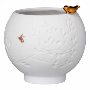 Świecznik ceramiczny, w środku szkliwiony, na zewnątrz matowy, ozdobiony tłoczonym wzorem oraz figurką ptaszka malowanego ręcznie na złoto.