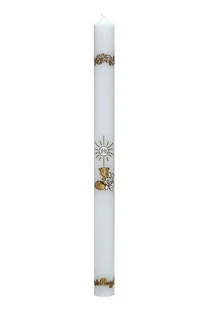 Świeca komunijna biała ze zdobieniami w kolorze złotym. Wymiary: wys. 40 cm x 3,2 cm Z uwagi na fakt że jest to wyrób ręczny, może zdarzyć się minimalna różn...