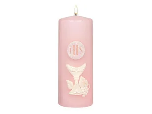 Świeca klubowa z hostią różowa duża Duża różowa świeca klubowa z nadrukiem hostii. Doskonale sprawdzi się jako dodatek do dekoracji stołu komunijnego. Różowy...