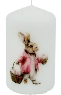Świeca Zajączek / Króliczek wielkanocny Świeca w kształcie walca z ozdobnym nadrukiem Zajączka wielkanocnego z koszykiem pełnym pisanek w odcieniach różu to ...