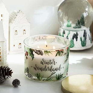 Dekoracja szklanego słoika ma leśny motyw z gałązkami, listkami i szyszkami w zielonym i brązowym kolorze. Na środku słoika znajduje się ozdobny napis Winter Wonderland. Świeca zamykana jest prostym, złotym wieczkiem o metalicznym wykończeniu. Świeca waży 285 gram. Przeznaczenie Świeca zapachowa HOMLA LESLI Black Currant będzie piękną ozdobą świąteczną do Twojego domu.