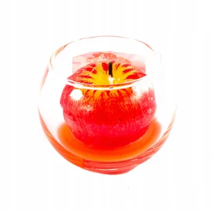 Ozdobna świeczka w kształcie kolorowego owocu. Idealny pomysł na prezent. Wymiary szklanego pojemnika ok. 7 x 7 x 6cm. W sprzedaży trzy kolory: czerwony, zie...