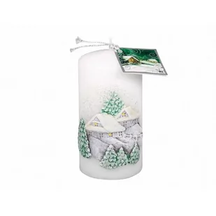 Biała świeczka o tematyce świątecznej w kształcie walca z motywem zaśnieżonej wsi – obrazek domków, choinek i zaśnieżonej krainy. Piękna dekoracja w domu lub miły prezent dla innych. Na pewno nie zawiedzie.