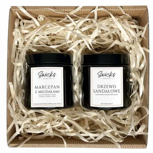 Zestaw świec sojowych w pudełku prezentowym 2x120ml MARCEPAN+DRZEWO SANDAŁOWE W skład zestawu wchodzą dwie świece sojowe, każda o pojemności 120 ml: Świeca s...