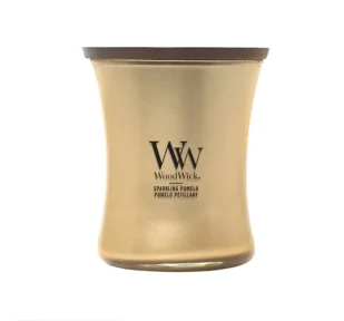 Świeca Woodwick Sparkling Pomelo z drewnianym knotem z kolekcji Precious Metals. Orzeźwiający zapach z nutami różowego pieprzu, liczi i grejpfruta tworzy luksusową atmosferę i wydaje kojący dźwięk.