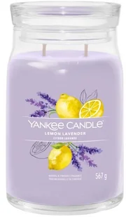 Świeca duża Signature Lemon Lavender, Yankee Candle Nowe świece Signature od Yankee Candle®! Odświeżony design słoika, dwa bawełniane knoty i najwyższej jakości mieszanka wosku sojowego zapewniają równomierne spalanie i otulą Twoje wnętrze zapachem. Ręcznie ilustrowane etykiety i żywe kolory wosku idealnie oddają zapach danej świecy. Odkryj kolekcję Signature już dziś… Świeży, czysty zapach. . . pikantna mieszanka słodkiej cytryny i kwiatów lawendy. Nuty górne: