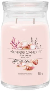 Świeca duża Signature Pink Sands, Yankee Candle Nowe świece Signature od Yankee Candle®! Odświeżony design słoika, dwa bawełniane knoty i najwyższej jakości mieszanka wosku sojowego zapewniają równomierne spalanie i otulą Twoje wnętrze zapachem. Ręcznie ilustrowane etykiety i żywe kolory wosku idealnie oddają zapach danej świecy. Odkryj kolekcję Signature już dziś… Unoszący się w powietrzu aromat drzewa cytrusowego, różowych kwiatów oraz pikantnej wanilii. bryzy. Nuty górne: Nuty cytrusowe, melon, jagody.