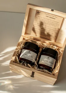 Zestaw 2 świec w ekologicznym drewnianym pudełku. W skład zestawu wchodzą 2 świece sojowe w szklanym słoiku o pojemności 120 ml każda o dowolnie wybranym dos...