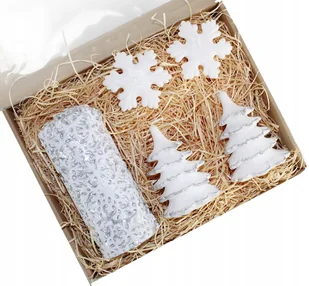 Zestaw prezentowy świąteczny świeczka choinki 10 cm kolor biały z srebrnymi gałązkami x2 + walec płatek śniegu kolor srebrny + świeczki gwiazdki 2 szt białe ...