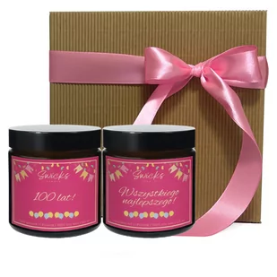 Idealny prezent na urodziny. Dwie zapachowe świece sojowe w pudełku na urodziny z napisami Wszystkiego Najlepszego oraz Sto Lat. W skład zestawu wchodzą dwie świece sojowe z napisami Wszystkiego Najlepszego oraz Sto Lat. Świece zapakowane są w ozdobne kartonowe karbowane pudełko o wymiarach około 15 cm x 15 cm. Pudełko wypełnione jest ekologicznym wypełniaczem oraz przewiązane różową wstążką.
