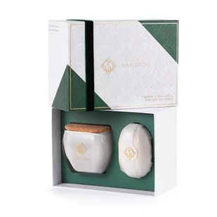 Zestaw Saudate świeca i mydło cedr i bergamotka Specjalna świeca z drewnianym knotem, przywołująca wspomnienia płonącego kominka, o wyjątkowym zapachu cyprysu i bergamotki oraz luksusowe mydło, produkowane tradycyjną metodą. Wszystko ręcznie wyselekcjonowane i zapakowane. Ten zestaw to połączenie świeżego i drzewnego aromatu cyprysu z cytrusowym i wysublimowanym aromatem bergamotki. Całość jest zapakowana w luksusowe pudełko z satynową kokardką. Zestaw: Mydło 200g + świeca 180g.