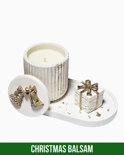 Zestaw Złota Świąteczna Harmonia - 3 elementy - Świeca Sojowa o Zapachu Christmas Balsam - Podstawka - Zestaw idealny na Prezent