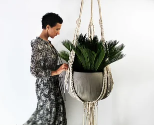 Makramowy kwietnik w rozmiarze XXL, wykonany z wysokiej jakości naturalnego sznurka bawełnianego. Polecany do dużych przestrzeni, szczególnie salonu i sypialni. Wysokość całkowita (od górnego kółka do końca ...