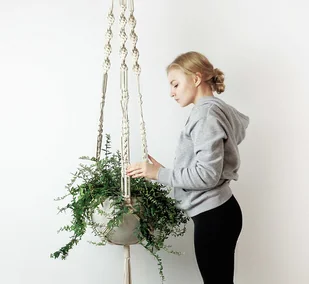 Makramowy kwietnik w rozmiarze XXXL, wykonany z naturalnego sznurka bawełnianego. Polecany do dużych przestrzeni, szczególnie salonu i sypialni. Wysokość całkowita (od górnego kółka do końca frędzli): ...