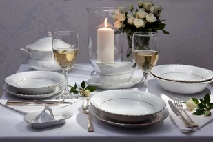 Komplet Iwona tworzą 6 talerzy deserowych o średnicy 19 cm , 6 talerzy płytkich o średnicy 24 cm oraz 6 talerzy głębokich o średnicy 22, 5 cm . Wykonane z polskiej porcelany wyróżniają się niezwykłą delikatnością , a zarazem wysoka wytrzymałością . Talerze posiadają klasyczny, okrągły kształt wzbogacony finezyjnym plisowaniem i 2 złotymi liniami, które naniesiono ręcznie . Stąd, naczyń nie należy myć w zmywarkach i podgrzewać w kuchence mikrofalowej. Ponadczasowy styl zestawu zachwyci nie tylko tradycjonalistów, ale i miłośników nowoczesnych rozwiązań.