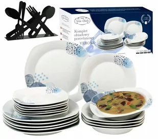 Serwis talerzy zestaw komplet OBIADOWY 18el 6 osób Obiadowy zestaw talerzy składający się z 18 elementów. Komplet wykonany z wysokiej klasy porcelany dla 6 osób. Piękny wzór w kształcie nieregularnych wzorów jak i niestandardowy, kwadratowy kształt przypadnie do gustu zarówno młodszym osobom, lubiącym nowoczesność jak i dojrzalszym, stawiającym na zdobienia klasyczne. Linia VERONA - kształty idealnie skomponuje się z syto zastawionym stołem na każdej domowej jak i firmowej imprezie. Dzięki odporności na wysokie temperatury, wszystkie elementy zestawu można myć w zmywarce, dzięki czemu utrzymanie kompletu w czystości jest łatwe i bezproblemowe.