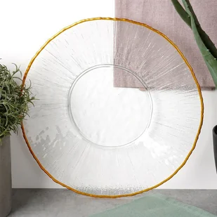 Elegancki talerz obiadowy VILDE 139721 — płytki szklany o średnicy 28 cm w złotym wykończeniu. Uniwersalny design pasuje do każdej zastawy, imponuje stylem i trwałością. Idealny do codziennych posiłków i wyjątkowych okazji. Waga brutto: 1400 g. Kup teraz i odmień stół!
