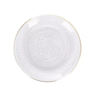 Dekoracyjne szkło Rant ozdobiony złotym kolorem Średnica: 15 cm Mycie ręczne Talerz deserowy szklany ze złotą obwódką Talerzyk deserowy HOMLA DAJANA wykonany został z dekoracyjnego szkła z deseniem w kropeczki. Uroku dodaje mu ozdobne wykończenie w postaci złotego paska na krawędzi talerza. Przeznaczenie Talerzyk DAJANA idealnie pasuje do różnych okazji — przyjęć, uroczystych obiadów, romantycznych kolacji oraz spotkań przy kawie. Wspaniale wygląda na elegancko nakrytym stole oraz na małym stoliku kawowym.
