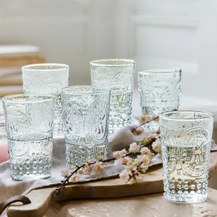 Te szklanki z ustnie dmuchanego szkła w antycznym stylu zachwycają dużym, ozdobnym reliefem. Zestaw składa się z 6 solidnych szklanek, które dzięki pięknemu reliefowi zawsze dobrze leżą w dłoni. Czy to jako zwykła szklanka do wody lub świeżo wyciśniętego soku pomarańczowego rano, czy do lampki wina wieczorem – te stylowe oryginalne naczynia zawsze będą dobrym wyborem. Kolejna zaleta: szklanki można myć w zmywarce.