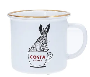 Emaliowany kubek do kawy z kolekcji Costa Coffee. Kubek posiada nadruk nawiązujący do powieści "Alicja w Krainie Czarów" oraz górną część pokrytą złotem 24K. Pojemność kubka wynosi 320 ml.