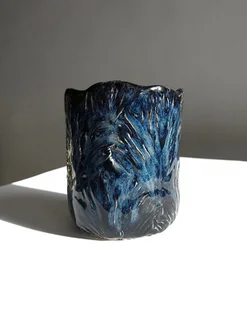 Czarka z wypukłą teksturą płatków kwiatów w kolorze granatowo-niebieskim. Nie korzystam z koła garncarskiego oraz form do odlewów. Kubeczek został ulepiony i ozdobiony ręcznie, dlatego posiada delikatni ...