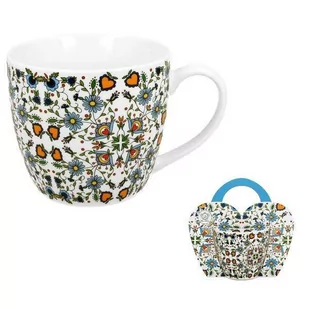 Kubek z finezyjnymi zdobieniami etnicznymi jako tradycyjne wycinanki z niebieskimi kwiatuszkami. Wykonany z najwyższej jakości porcelany. Zapakowany w ozdobne opakowanie z rączką. Nadaje się do zmywarki i mikrofalówki.