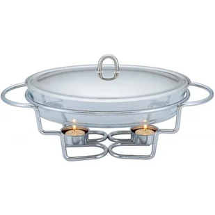 Szklany podgrzwacz do potraw. Pokrywa z wysokiej jakości stali nierdzewnej. Szklany wkład w metalowej podstawie. Dwie świece podgrzewające żywność. Nadaje się do zmywania w zmywarkach. Szklany wkład można używać w mikrofalówkach.