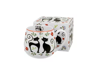 Kubek baryłka 430 ml KOTY ETNO wchodzący w skład serii ETNO, wykonany z porcelany New Bone China, która charakteryzuje się naturalnym kremowo-białym kolorem z delikatnym połyskiem oraz wyjątkową wytrzymałością i trwałością, zachowując lekkość i finezję. Linia charakteryzuje się zarówno nowoczesnym jak i fantazyjnym designem, a zdobienie motywem figlarnych czarnych kotów na tle malowanych kolorowych kwiatków zadowoli wszystkich miłośników tego zwierzątka. Całość zapakowana w ozdobne pudełko dekorowane tym samym motywem to doskonały pomysł na niebanalny prezent urodzinowy i świąteczny, a także podarunek dla szefa czy nauczyciela, również jako podziękowanie.