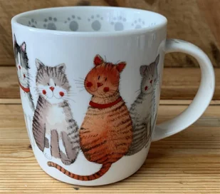 Kubek M52 4 koty. Kubek. Przepięknie ilustrowany kubek idealny do kawy, herbaty i innych gorących lub zimnych napojów Wokół wewnętrznej krawędzi i wzdłuż rączki znajdują się wyjątkowe ilustracje Pojemność 400 ml Wymiary 90 x 88 mm Kubek można myć w zmywarce i używać w kuchence mikrofalowej
