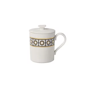 Kubek MetroChic Gifts z pokrywką 0,30 l marki Villeroy & Boch Signature - Wysokiej jakości porcelana kostna- można myć w zmywarcePierwszy wybór!Waga: ok. 288gZawartość: ok. : 300mlNumer artykułu: 10-4483-4855GTIN: 4003686381933Wykończenie z 20-karatowego złota Kolekcja MetroChic to eleganckie zestawienie czerni, bieli i złota, które zachwyca nowoczesnym, geometrycznym dekorem na eleganckiej porcelanie kostnej premium.