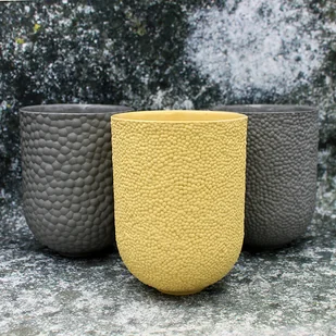 Ceramiczny kubek ręcznie wykonany z mocno spieczonej barwionej na jasnożółto porcelany, inspirowany mikrostrukturami form organicznych, wewnątrz szkliwiony błyszczącym bezbarwnym szkliwem. Szkliwo przezn ...