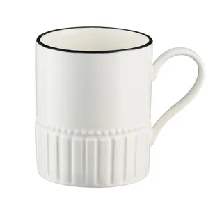 porcelana kolor: biały, czarna obwódka wymiary: średnica 8 cm, wysokość 9,8 cm pojemność 370 ml do zmywarki do kuchenki mikrofalowej