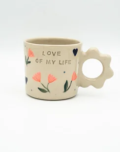Ceramiczny kubek malowany podszkliwnie w kwiatki serduszka. Posiada wyciśnięty napis Love of my life. Wewnątrz i na zewnątrz pokryty jest bezbarwnym szkliwem. Zastosowane szkliwo jest bezpieczne do kon ...