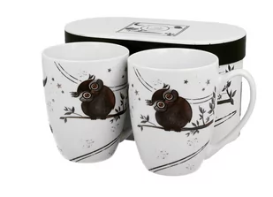 Komplet dwóch kubków 380 ml CHARMING OWLS wchodzący w skład serii Animals, wykonany z porcelany New Bone China, charakteryzującej się elegancką i naturalną kremowo - białą barwą z delikatnym połyskiem, a także wyjątkową wytrzymałością. Linia zdobiona motywem figlarnych sówek w ciemnych, wyrazistych barwach. Kolekcja utrzymana w monochromatycznej kolorystyce oraz nowoczesnym designie wyróżnia się swoim charakterem oraz niepowatrzalną stylistyką. Całość zapakowana w ozdobne pudełko dekorowane tym samym motywem to doskonały pomysł na niebanalny prezent urodzinowy zarówno dla kobiety i mężczyzny, a także podarunek dla szefa czy nauczyciela, również jako podziękowanie.