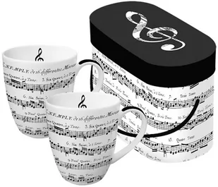 Komplet dwóch porcelanowych kubków ADAGIO, w kolorze białym, z motywem czarnego zapisu nutowego. Kubki zapakowane są w ozdobne pudełko o tym samym motywie. Średnica kubka: 8 cm, wysokość: 10. 4 cm Wymiary pudełka: