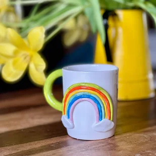Rozpocznij dzień z kubkiem pełnym radości! Ten unikalny, ręcznie wykonany kubek ozdobiony jest trójwymiarową tęczą i puszystymi chmurkami, które dodają mu uroku. Zielony uchwyt podkreśla jego delikatny ...