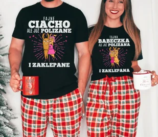Stylowe i zabawne czarne koszulki z humorystycznymi nadrukami, które idealnie sprawdzą się jako prezent dla zakochanych. Na jednej koszulce widnieje napis: "Fajne ciacho, ale już polizane i zaklepane", a na drugiej: "Fajna babeczka, ale już polizana i zaklepana". Koszulki wykonane z wysokiej jakości bawełny, miękkiej i przyjemnej w dotyku, z trwałym nadrukiem odpornym na pranie.