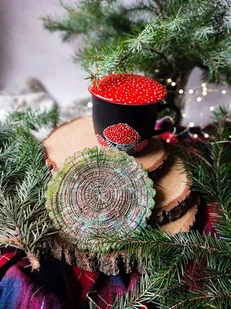 Świąteczny zestaw prezentowy zawiera: -kubek ręcznie malowany z pokrywką 350ml i sitkiem do ziół i herbaty -podkładkę z żywicy w kształcie plastra drewna: 12cm średnicy i 8mm wysokości To wspaniały prezent dla ...