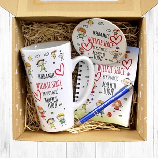 Zestaw prezentowy w kartoniku w serduszka kubek Latte 450 ml z notesem i długopisem - Trzeba mieć wielkie serce, by kształcić małych ludzi