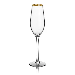 Przeznaczenie Kieliszek do szampana transparentny FELICE to element szklanej zastawy, który powinien znaleźć się w każdym domu. Przeznaczony do szampana przyda się na specjalne okazje i wystawne uroczystości. Cechy charakterystyczne Klasyczny i uniwersalny transparentny kolor dopełniony jest złotym zdobieniem krawędzi, który dodaje całości wyjątkowego charakteru. Smukły kieliszek pojemności 0,24 l osadzony jest na długiej nóżce oraz stabilnej podstawie. Materiał Wysokiej jakości szkło zapewni odpowiednią oprawę nawet dla wytrawnych alkoholi.