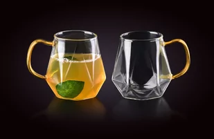 przeźroczyste szkło ze złoto-miodowym uchem. U podstawy posiada diamentowy wzór.