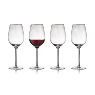 Kieliszki do czerwonego wina Palermo 4 sztuki 400 ml marki Lyngby Glas. Kieliszki do czeronego wina wykonane z karbowanego szkła dodatkowo ozdobionego złotą obwódką. Elegancki, wysublimowany design, sprawia, że produkt ten prezentuje się lekko i eterycznie, gładko łącząc styl vintage z nowoczesnością. Trunek podawany w tym szkle, podczas gdy światło pięknie zostaje rozproszone na drobnych fasetach, będzie prezentować się wyjątkowo i równie wyjątkowo smakować. Zgrabna, wysoka nóżka w połączeniu z pękatą czaszą w kształcie tulipana, pozwoli na degustację trunku w odpowiedniej temperaturze, jak również przy maksymalnym skupieniu aromatu napoju w górnej części kieliszka.