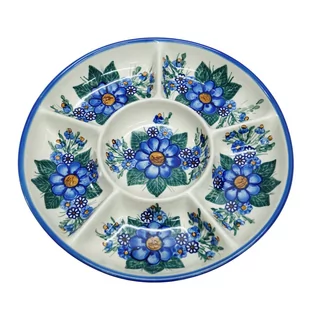Półmisek okrągły dzielony to wspaniały pomysł na podanie na stół pięknie ułożonych i udekorowanych sałatek, surówek, mięs, ziemniaków, frytek, batatów. Potrawy umieszczone na talerzu mogą zostać ułożone w oryginalny sposób, oddzielone od siebie. Na półmisku można poukładać kolorowe sałatki, mięsa, warzywa. Wyjątkowy stół, oryginalnie podane potrawy, podczas Twojego przyjęcia, dzięki ręcznie wykonanym ceramicznym naczyniom ze zdobieniom podszkliwnym. Piękne, ręcznie dekorowane i glazurowane, talerze ceramiczne zdobione są różnokolorowymi wzorami, zieleń, czerwień, brąz, bolesławiecki kobalt, to to co dodaje wyjątkowej unikatowości i dyskretnej elegancji naczyń ceramicznych.