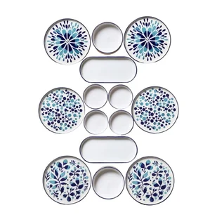 Zestaw zawiera: 6 talerzy o średnicy 19 cm, 2 owalne talerze (25 x 11 x 3,5 cm), 6 misek o pojemności 150 ml (10,5 x 10,5 x 3,5 cm).